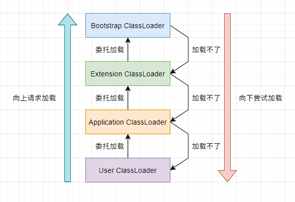 简单通俗的来讲就是,先把类加载的任务交给父加载器,父加载器做不到,那么子加载器才会取尝试加载,举个例子来说就是我想要买一个东西,我首先会先问问老爸能不能帮我买,如果可以,那么就不用我出钱了,如果不行,那就只能自掏腰包了。